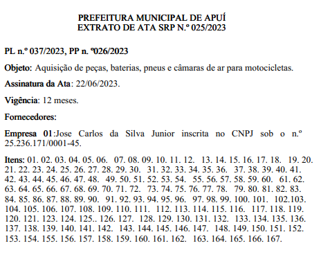 25.236.171/0001-45. Para o fornecimento de pneus, baterias, câmaras de ar para motocicletas e peças.