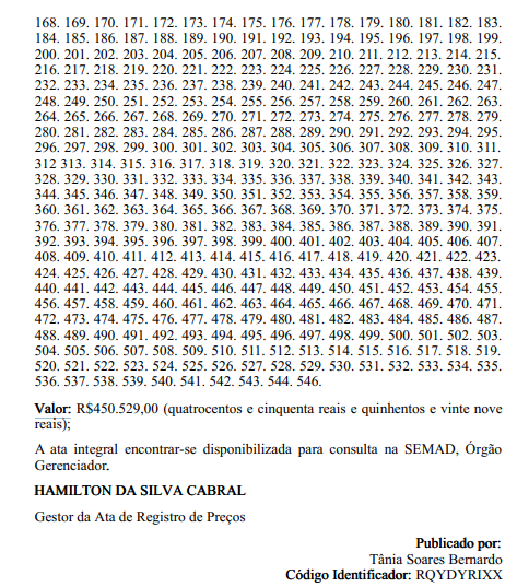 A empresa receberá o valor total de R$450.529,00 (quatrocentos e cinquenta reais e quinhentos e vinte nove reais). Os itens não foram revelados na publicação no Diário dos Municípios.