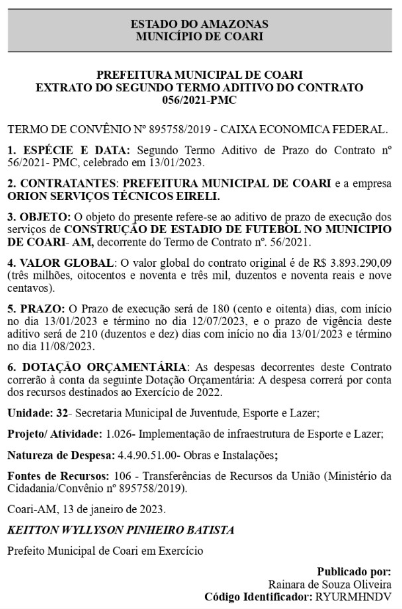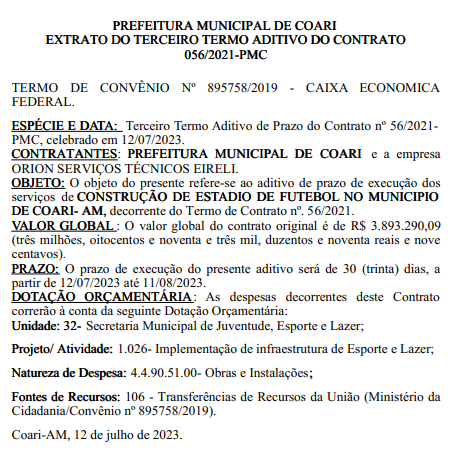 O terceiro aditivo de prazo do contrato, realizado no dia 12 de julho deste ano, entre a empresa ORION SERVIÇOS TÉCNICOS EIRELI, inscrita no CNPJ nº 28.254.636/0001-89 com a prefeitura de Coari-AM. Para a construção de estádio de futebol no município.