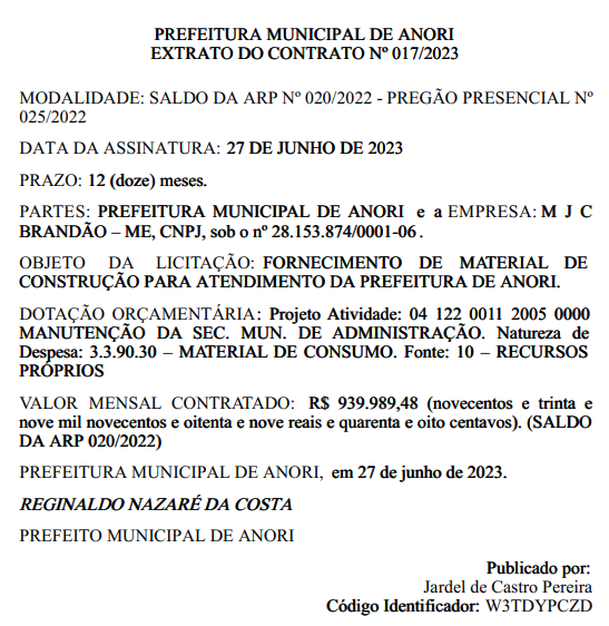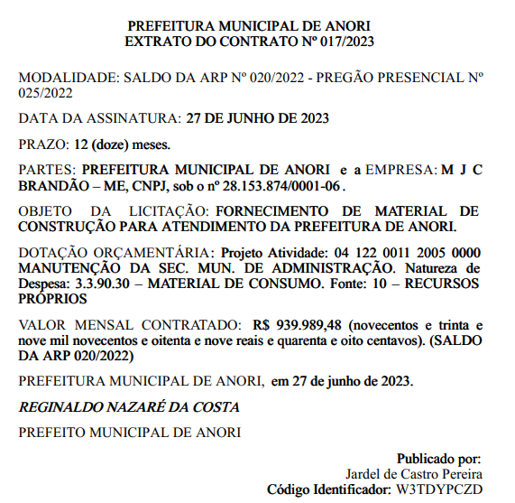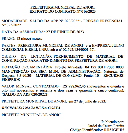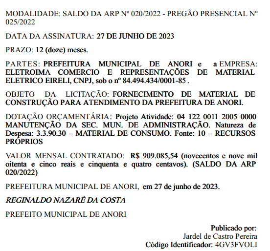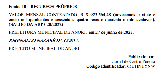 O montante somam o valor total de R$ 3.763.001,95 (três milhões, setecentos e sessenta e três mil, um real e noventa e cinco centavos). Com o prazo de vigência de 12 (doze) meses, a partir da data de assinatura, assinado pelo prefeito município, Reginaldo Nazaré, no dia 27 de junho de 2023.