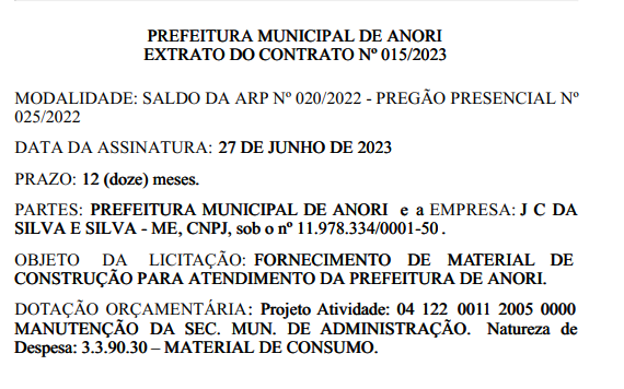 O prefeito do município resolve contratar 5 empresas para a aquisição de materiais de construção para atender a prefeitura de Anori. A empresa ELETROIMA COMERCIO E REPRESENTAÇÕES DE MATERIAL ELETRICO EIRELI, inscrito no CNPJ, sob o nº 84.494.434/0001-85. A empresa receberá o valor de R$ 909.085,54 (novecentos e nove mil e nove mil oitenta e cinco reais e cinquenta e quatro centavos).