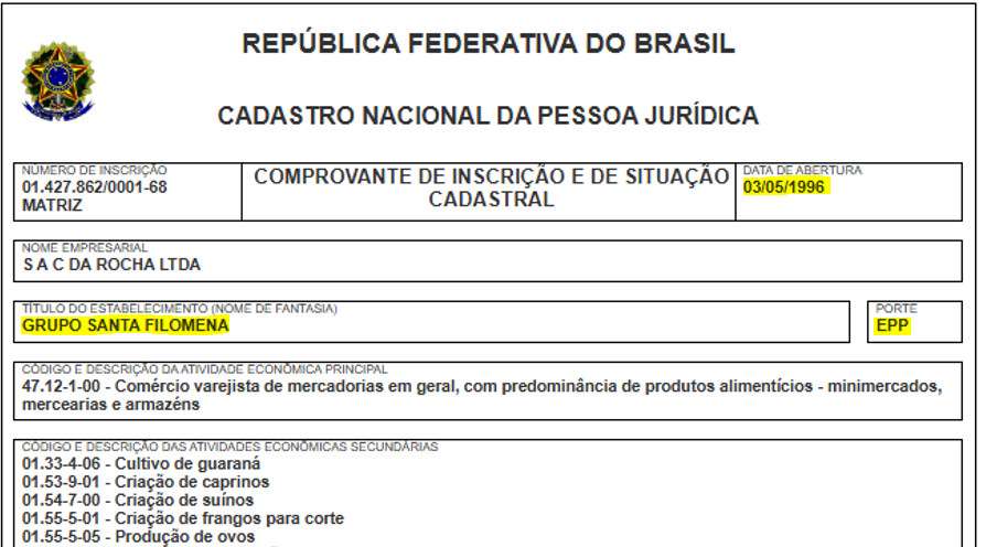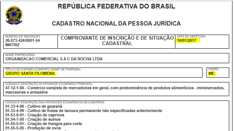 Ambas, com o nome fantasia “Grupo Santa Filomena” e apresentando serviços de venda e comércio varejista de produtos alimentícios, incluindo mercearias e minimercados.