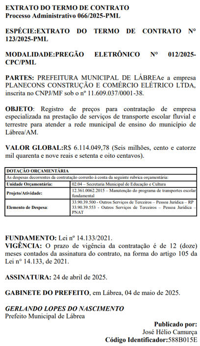 O prefeito de Lábrea, Gerlando Lopes (PL), assinou um contrato de R$ 6 milhões com a empresa do vereador de Maués, Simoca (União Brasil), para realizar o transporte fluvial e terrestre de alunos da rede pública do município.