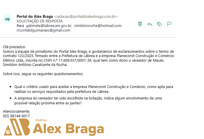 A equipe de jornalismo do Portal Alex Braga, tentou contato com a prefeitura de Lábrea e o e as empresas do vereador Simoca, para pedir mais esclarecimentos sobre o contrato.