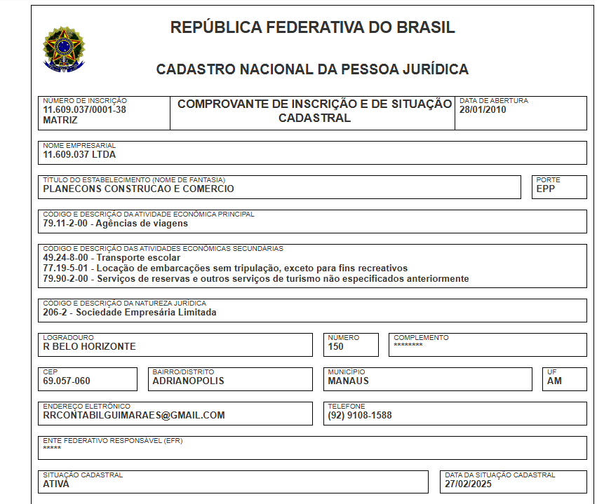 A empresa tem como nome fantasia “Planecons Construção e Comércio”, inscrita no CNPJ nº 11.609.037/0001-38, nominação inconsistente com os serviços apresentados pela empresa.