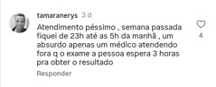“Semana passada fiquei de 23h até as 5h da manhã esperando atendimento. Um absurdo! Apenas um médico atendendo. Fora que o exame demorou três horas pra sair o resultado”, relatou outra usuária no Instagram.