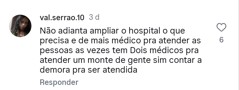“Não adianta ampliar hospital se o que precisa é mais médico. Às vezes tem dois médicos pra atender um monte de gente. Sem contar a demora absurda para ser atendido”, comentou outro.