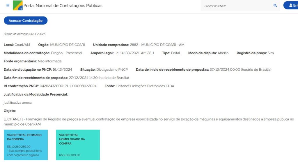 Outra problemática é a falta de transparência da Prefeitura de Coari, que não mantém suas licitações atualizadas, o que fere o princípio da transparência pública previsto na Lei de Acesso à Informação. A reportagem teve acesso aos processos citados apenas por meio do PNCP.