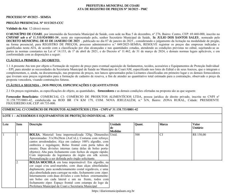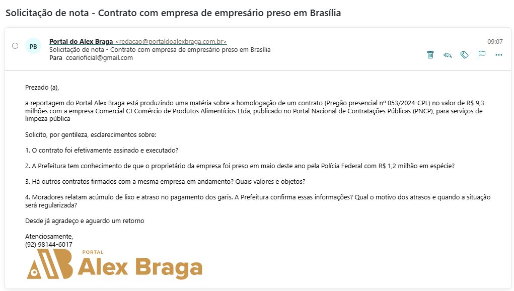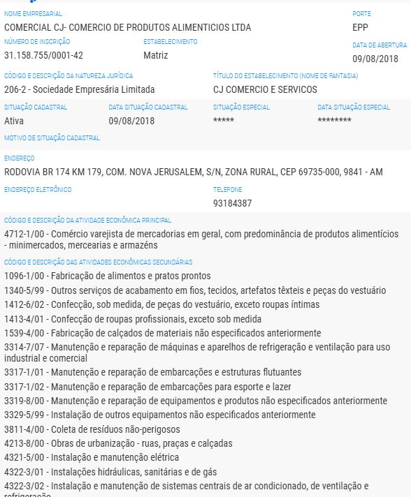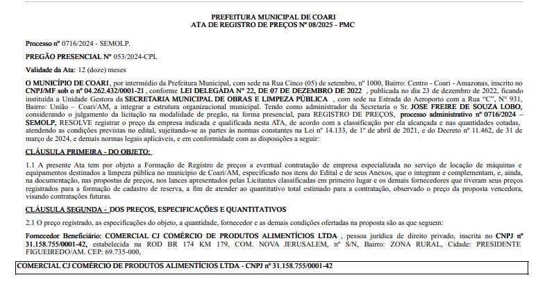 A reportagem entrou em contato com a Prefeitura de Coari para pedir esclarecimentos sobre a homologação do contrato e aguarda resposta. Também tentou contato com a empresa Comercial CJ Comércio de Produtos Alimentícios Ltda, mas não conseguiu localizar o responsável. No cadastro da Receita Federal, a empresa não informa e-mail para contato e apresenta apenas um número de telefone, sem WhatsApp e que não funcionou para ligação. O endereço registrado também chama atenção: a empresa supostamente fica localizada em uma estrada na rodovia BR-174, no km 179, comunidade Nova Jerusalém, em Presidente Figueiredo.
