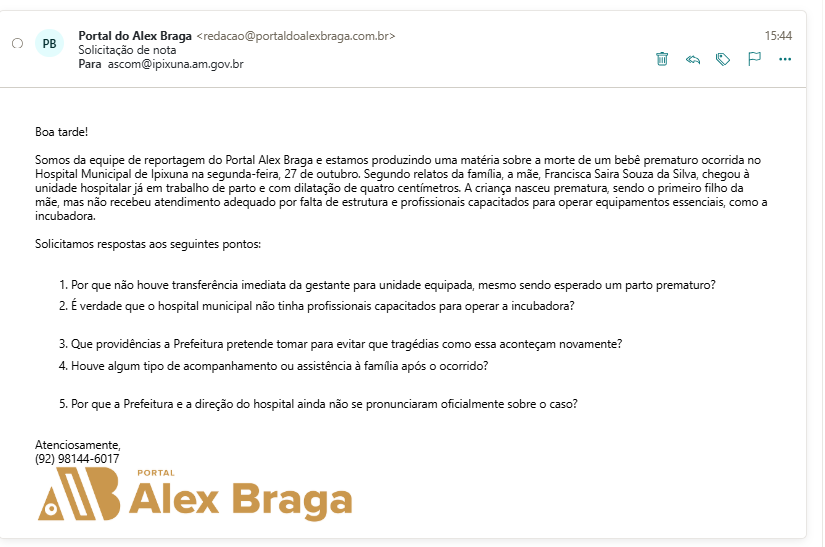 O Núcleo de Reportagem Investigativa do Portal Alex Braga entrou em contato com a prefeitura de Ipixuna para falar sobre o ocorrido, mas até a publicação desta matéria não obtivemos respostas. O espaço segue aberto para esclarecimentos.