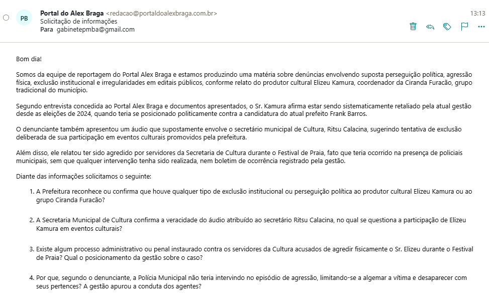 Ele também revela que grupos aliados à gestão receberam repasses até após o período junino, enquanto a Ciranda Furacão, que ensaia desde o início do ano, foi chamada para se apresentar só em outubro, nas festividades do aniversário da cidade.