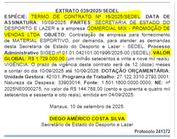 O Termo de Contrato n° 16/2025 foi publicado no Diário Oficial do Estado (DOE) e terá vigência até setembro de 2026. O contrato foi assinado pelo próprio secretário na quinta-feira (10) de setembro.