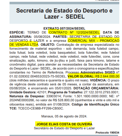 A empresa Comercial Mix, possui um longo histórico de contratações em secretarias do Governo do Amazonas. Em agosto do ano passado, a empresa foi contratada para fornecer material esportivo: bola de futebol, bola de basquete, voleibol, futevôlei, cones e kimono de jiu-jitsu entre outros materiais por mais de R$ 2,6 milhões.