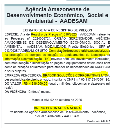 O extrato da Ata de Registro de Preço, foi publicado no Diário Oficial do Estado (DOE) e segundo as poucas informações repassadas o contrato de R$ 4.816.000,00 (Quatro milhões, oitocentos e dezesseis mil), será para: contratação de pessoa jurídica especializada na prestação de serviços de locação de equipamentos de tecnologia da informação e comunicação – TIC, novos e sem uso, devidamente instalados, com manutenção e substituição de peças e equipamentos defeituosos bem como atualização anualmente para atender as necessidades da AADESAM.