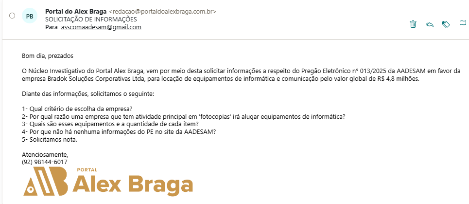 A equipe de reportagem do PAB, encaminhou um pedido de solicitação de nota referente ao Pregão Eletrônico.