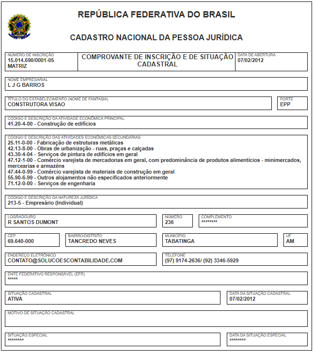 O primeiro contrato publicado, é feito com a empresa registrado como L J G BARROS-EPP, inscrita no CNPJ nº 15.014.690/0001-05. A empreiteira afirma em suas informações na Receita Federal, que presta serviços de construção de edifícios e ainda outras atividades de fabricação de estruturas, pintura, urbanização e até mesmo com o comércio varejista de alimentos.