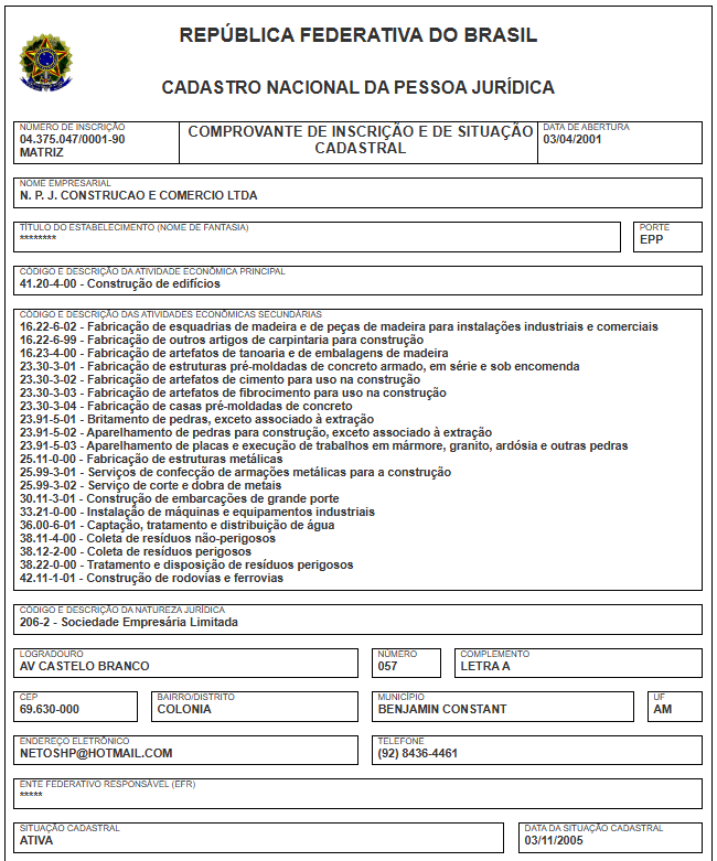 Assim como, com a primeira, foi firmado um contrato com a empresa N. P. J CONSTRUÇÃO E COMERCIO LTDA-EPP, sob o CNPJ nº 04.375.047/0001-90. Em suas informações cadastrais, ela afirma ter como atividade principal os serviços de construção de edifícios. Assim com outras diversas atividades secundárias.