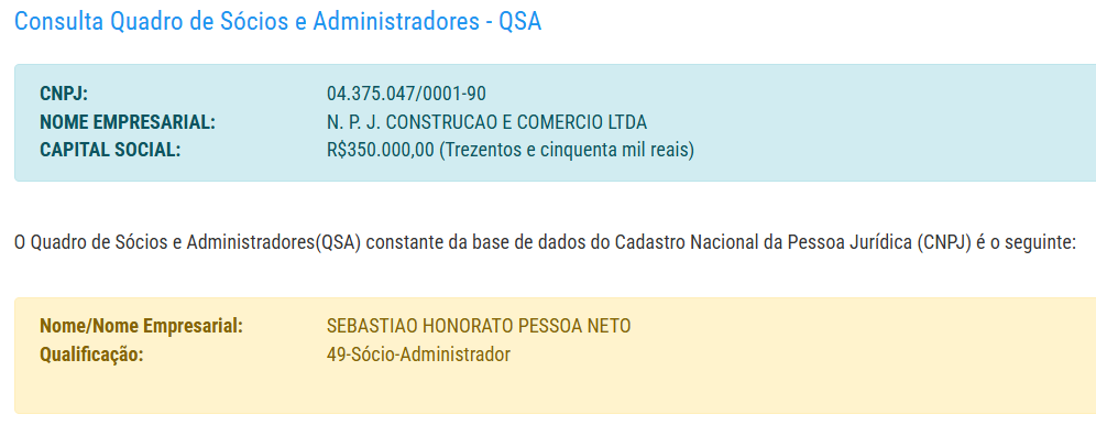 Em seu quadro de sócios e administradores, a empresa tem um capital social de R$ 350 mil, com um porte empresarial de Empresa de Pequeno Porte (EPP). Como sócio administrador, é apresentado o nome de Sebastião Honorato Pessoa Neto.