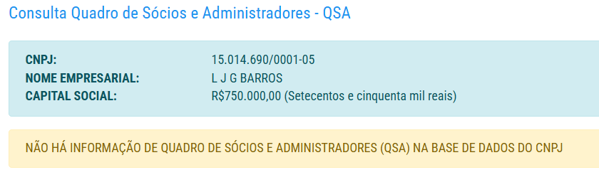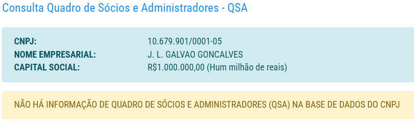 Ao visitar as informações do QSA da empresa, ela não apresenta informações sobre o responsável empresarial e nem mesmo sobre supostos sócios. A falta de informações abre margem sobre possíveis irregularidades na funcionalidade da empresa.
