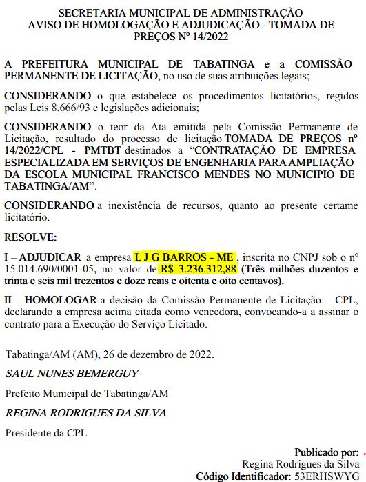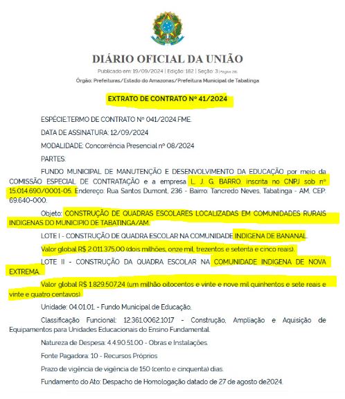 A primeira empresa L J G Barros, foi vencedora em contratos milionários assinados pelo ex-prefeito de Tabatinga, Saul Bemerguy. Tendo recebido mais de R$ 3 milhões para construir quadras em comunidades indígenas e mais de R$ 600 mil para reformar creche no município.