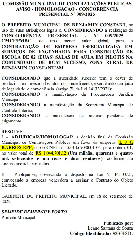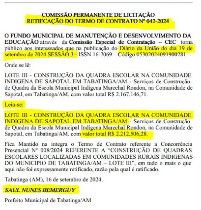 Conforme a publicação dos documentos, assinados pelo prefeito Semeide Bemerguy, o contrato foi firmado com três empresas diferentes. Cada uma, como responsável pela construção de uma escola nas comunidades rurais de Bom Sucesso, Pastor Lúcio e Novo Paraíso.