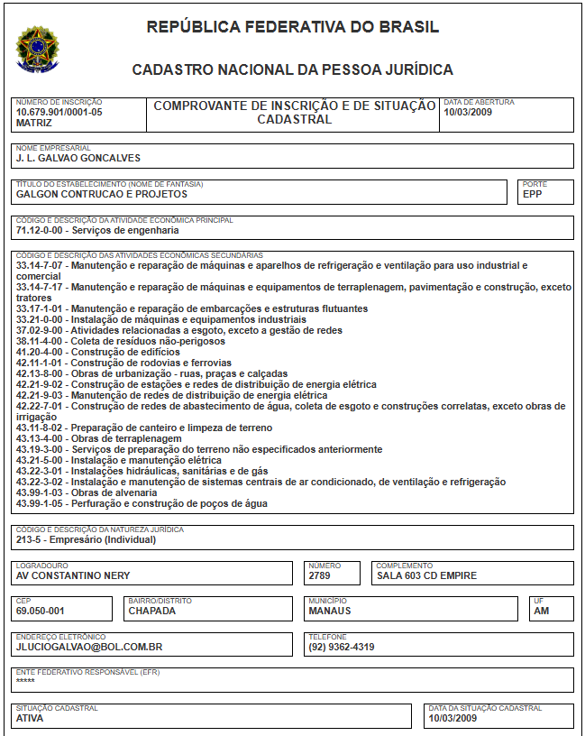 Conforme as informações no site da Receita Federal, a empresa tem a atividade principal os “Serviços de Engenharia” e ainda outras que envolve a manutenção e recuperação de máquinas de refrigeração, máquinas de terraplenagem, máquinas de embarcações etc.