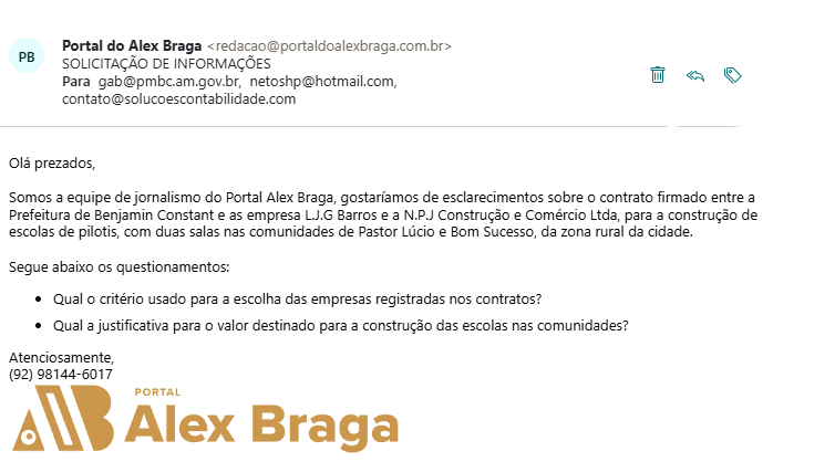 A equipe de jornalismo do Portal Alex Braga tentou contato com a Prefeitura de Benjamin Constant e com as empresas envolvidas nos contratos, para pedir mais esclarecimentos sobre a regularidade das contratações. Assim como, um posicionamento do prefeito Semeide Bemerguy sobre as recentes contratações às comunidades rurais do município.