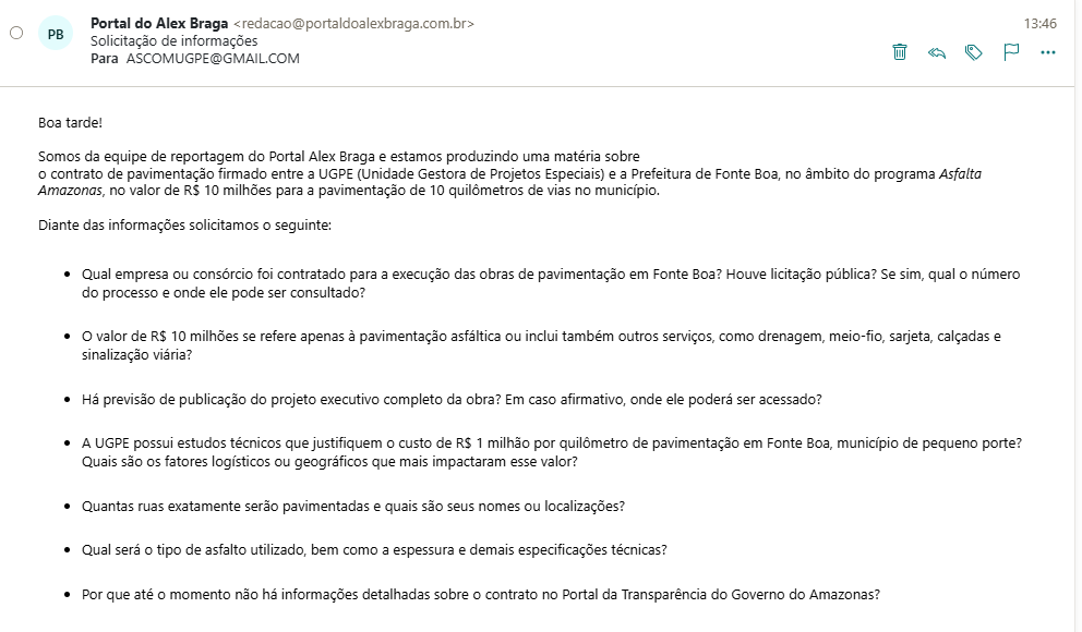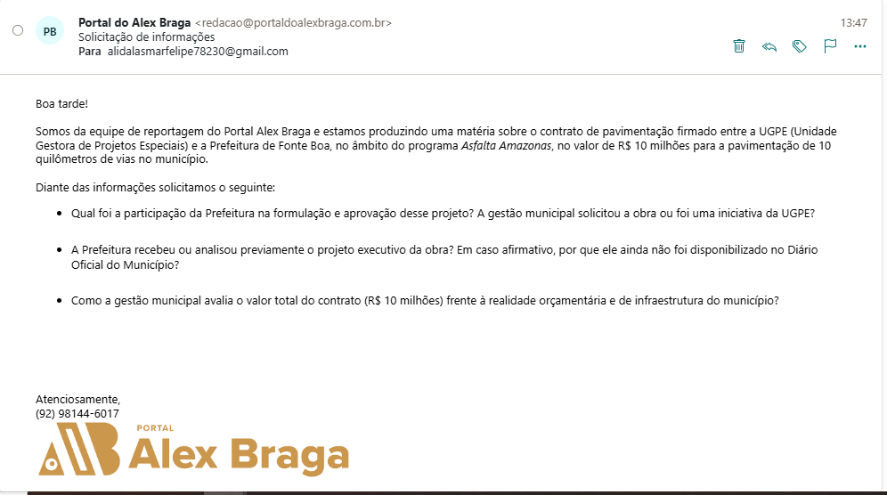 O Núcleo de Reportagem Investigativa do Portal Alex Braga entrou em contato com a UGPE e a prefeitura de Fonte Boa, mas até a publicação desta reportagem não obtivemos respostas. O espaço segue aberto para esclarecimentos.