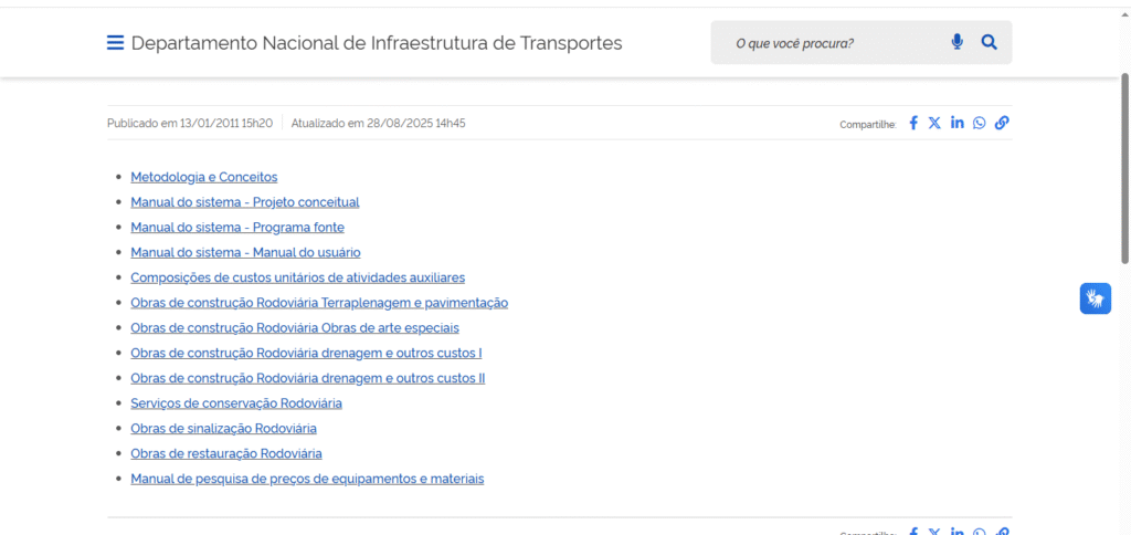 De acordo com os Custos Referenciais do Departamento Nacional de Infraestrutura de Transportes (DNIT), que são baseados no sistema SICRO (Sistema de Custos Referenciais de Obras Rodoviárias), existem metodologias detalhadas para calcular os custos de pavimentação, drenagem, meio-fio e sinalização em obras públicas, com valores de referência para composição de preços em diferentes contextos.