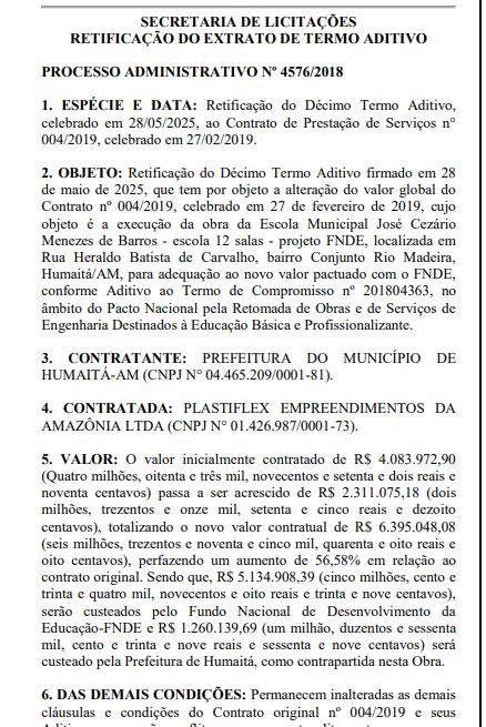 A Prefeitura de Humaitá (a 985 quilômetros de Manaus), sob a gestão do prefeito Dedei Lobo (União Brasil), voltou a alterar o contrato da obra da Escola Municipal José Cezário Menezes de Barros, que se arrasta desde 2019, na gestão de seu então aliado político, Herivâneo Seixas. A nova retificação, publicada nesta segunda-feira (6) no Diário Oficial Eletrônico dos Municípios do Estado do Amazonas, refere-se a um ajuste no valor do 10º termo aditivo que aumenta o valor de R$ 1,2 milhão para R$ 2,3 milhões, sem apresentar qualquer previsão para a entrega da obra nem justificativa para o acréscimo.