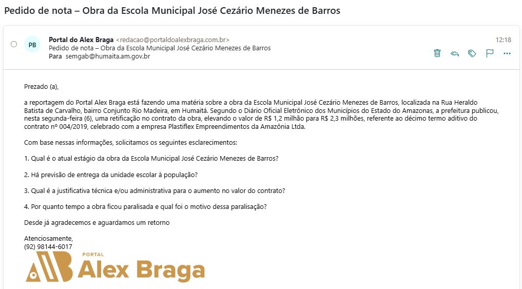 A reportagem do Portal Alex Braga entrou em contato com a Prefeitura de Humaitá para questionar o estágio atual da obra, se há previsão de entrega e qual a justificativa para a alteração no contrato, que aumentou o valor da construção em mais de 56%. Até o fechamento desta matéria, não houve resposta da gestão municipal, mas o espaço segue aberto para manifestações.