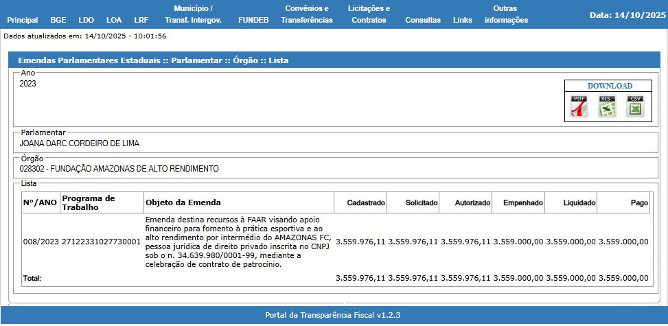 Dois anos depois de destinar R$ 3,5 milhões em emendas parlamentares ao Amazonas FC, sob a justificativa de financiar escolinhas de futebol de base, a deputada estadual Joana Darc (União Brasil) ainda não apresentou qualquer comprovação de que a promessa tenha sido cumprida. A reportagem do Portal Alex Braga apurou e não encontrou evidências de que essas escolas tenham sido implantadas ou estejam em funcionamento.