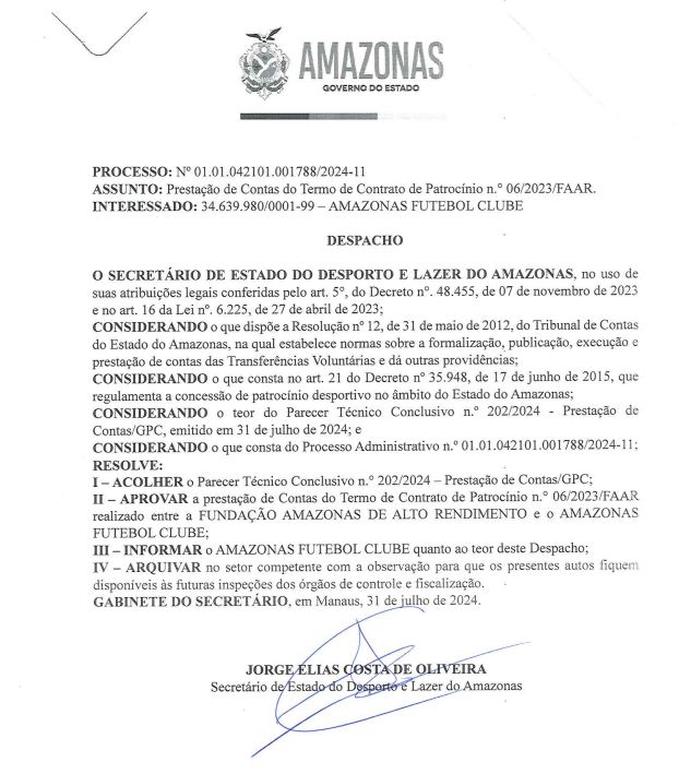 Segundo o clube, as contas do projeto foram aprovadas pela Sedel, de acordo com o Parecer Técnico Conclusivo nº 202/2024 – Prestação de Contas/GPC. O Amazonas acrescentou que, após o término do período previsto, as atividades foram mantidas por mais oito meses com recursos próprios, atendendo cerca de 12 mil participantes.