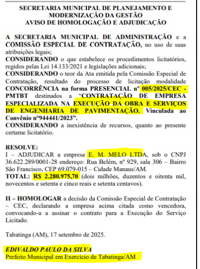O vice-prefeito de Tabatinga, Edivaldo Silva (MDB), assinou dois contratos que juntos chegam a mais de R$ 11,8 milhões para pavimentação. O que chama atenção, é que em nenhum dos contratos, a prefeitura revela onde será realizado essas obras.