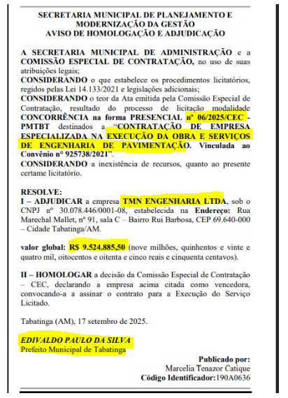 Os documentos foram publicados no Diário Oficial dos Municípios (DOM) e assinados pelo vice-prefeito em 17 de setembro. As Concorrências 005 e 006/2025 contém o mesmo objeto de contratação: empresa especializada na execução de obras e serviços de engenharia de pavimentação.