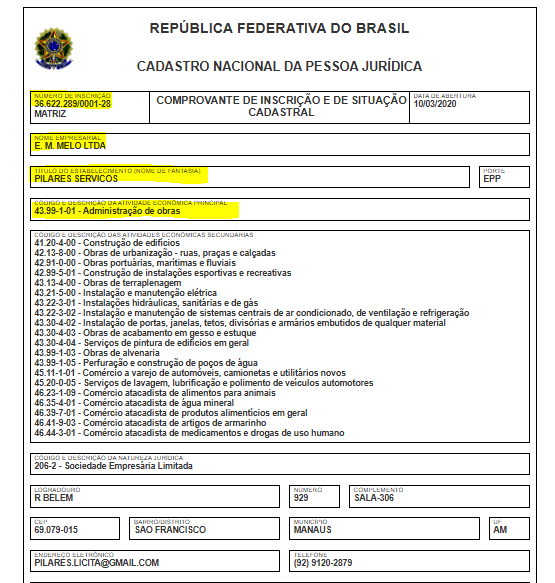A empresa com a razão social E. M. Melo Ltda, tem o nome fantasia Pilares Servicos, opera com o CNPJ 36.622.289/0001-28 e foi fundada em 2020. O endereço de sua sede está localizada na Rua Belém, 929 – São Francisco, Manaus. Sua atividade principal é de Administração de obras.