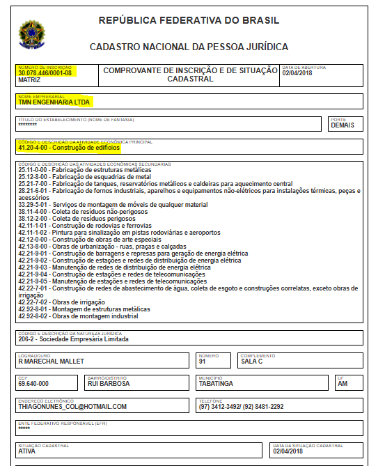 A segunda empresa com a razão social Tmn Engenharia Ltda, opera com o CNPJ 30.078.446/0001-08 e foi fundada em 02/04/2018. O endereço de sua sede está localizada na Rua Marechal Mallet, 91, Tabatinga. Sua atividade principal é de Construção de edifícios.
