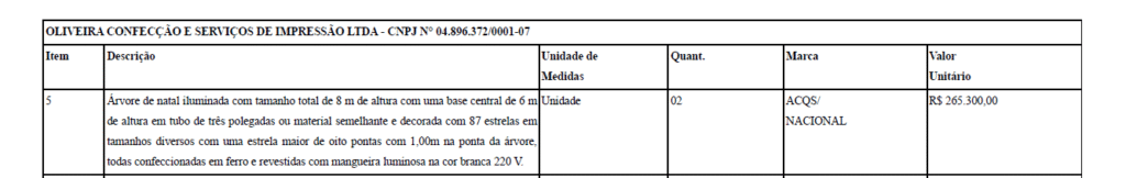 Entre os itens mais absurdos e injustificáveis estão as duas árvores de Natal gigantes de 8 metros, adquiridas por R$ 265.300,00 cada, totalizando R$ 530.600,00 do dinheiro da população. As estruturas exigem iluminação especial, base metálica reforçada e 87 estrelas decorativas encaixadas na armação, e custam, sozinhas, mais que muitas obras públicas abandonadas em Coari.