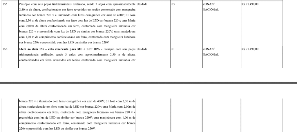 A prefeitura também decidiu investir pesado, e desproporcionalmente, em presépios gigantes. Cada unidade, produzida com figuras de até 2,5 metros e revestidas com mangueiras luminosas, custou R$ 71.490,00. Foram comprados quatro, somando R$ 285.960,00, o equivalente ao que muitos municípios destinam para manutenção básica de serviços essenciais.