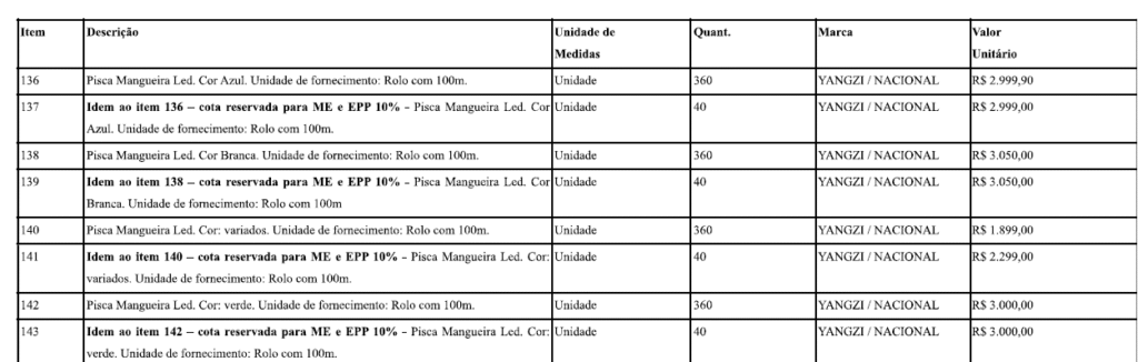 Mas o verdadeiro rombo aparece nos gastos com iluminação. Apenas em mangueiras de LED, os valores ultrapassam facilmente R$ 3 milhões. Foram adquiridos 360 rolos de LED azul por R$ 2.999,90 cada, totalizando mais de R$ 1 milhão. Outros 360 rolos de LED branco por R$ 3.050,00 somam mais R$ 1,09 milhão. E os 360 rolos de LED verde a R$ 3.000,00 cada acrescentam R$ 1,08 milhão à conta.