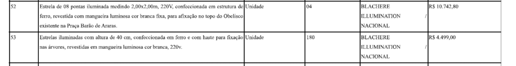 A prefeitura ainda comprou 180 estrelas iluminadas de 40 cm, ao custo unitário de R$ 4.499,00, resultando em impressionantes R$ 809.820,00. Outras quatro estrelas gigantes para o obelisco da praça custaram R$ 10.742,80 cada. As guirlandas de 80 cm saíram por R$ 1.719,99 cada, totalizando mais de R$ 137 mil.
