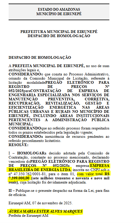 O documento foi publicado no Diário Oficial dos Municípios (DOM), e assinado por Áurea na última sexta-feira (7). Ainda, o extrato de homologação revela que a contratação será para: “contratação de empresa de engenharia especializada nos serviços de manutenção preventiva, corretiva, recuperação, revitalização, gestão e eficientização energética nas áreas públicas urbanas e rurais no município de Eirunepé, incluindo áreas institucionais pertencentes a administração pública municipal”.