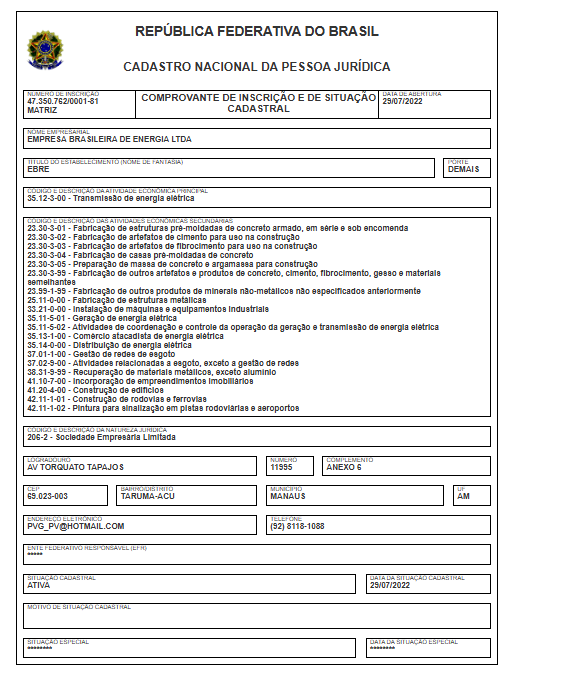 A empresa com a razão social Empresa Brasileira de Energia Ltda, tem o nome fantasia Ebre, opera com o CNPJ 47.350.762/0001-81 e foi fundada em 29/07/2022. O endereço de sua sede está localizada na Avenida Torquato Tapajós, 11995 – Tarumã-Açu, Manaus – AM. Sua atividade principal é de Transmissão de energia elétrica.