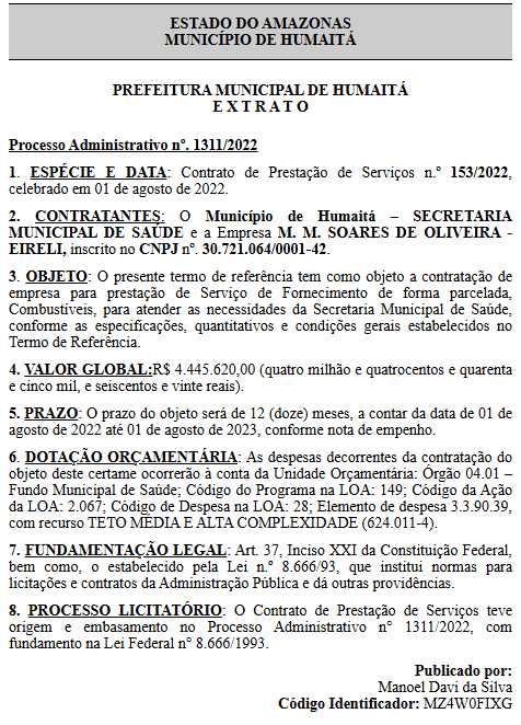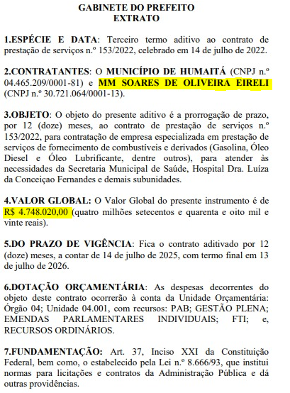 O prefeito de Humaitá, Dedei Lobo (União Brasil), assina o terceiro aditivo em contrato de mais de R$ 4,7 milhões para comprar combustíveis e derivados de uma empresa para atender um Hospital de Terapia Intensiva (UTI), localizada no município.