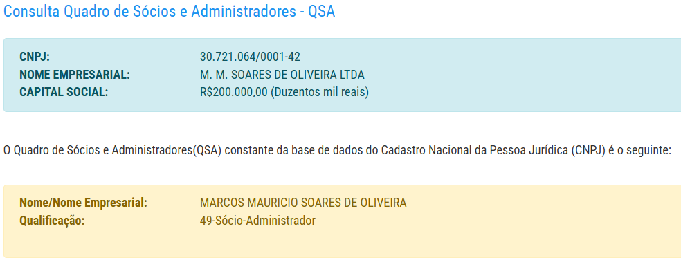 Segundo as suas informações cadastrais, ela tem como porte empresarial, classificado como EPP (Empresa de Pequeno Porte) e um capital social de R$ 200 mil. Além disso, a empresa está registrada no nome do empresário, identificado como Marcos Maurício Soares de Oliveira.