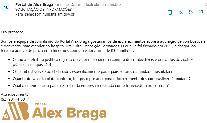 A nossa equipe de Jornalismo do Portal Alex Braga pediu mais esclarecimentos sobre a contratação da empresa e o alto valor destinado para a compra de combustíveis ao Hospital Dra Luiza Conceição Fernandes, para que justifique a retirada do valor milionário dos cofres públicos. Contudo, até o fechamento desta matéria não obtivemos retorno. O espaço segue aberto para mais esclarecimentos.