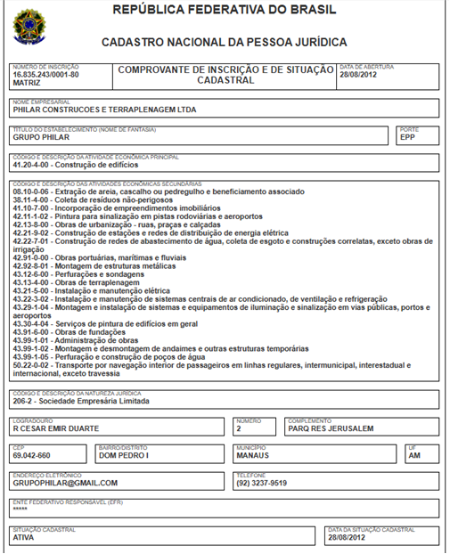 A empresa registrada no contrato, tem como nome fantasia “Grupo Philar”, inscrita no CNPJ nº 16.835.243/0001-80. No site da Receita Federal, a mesma tem como atividade principal a “construção de edifícios” e outras atividades relacionadas a extração de areia, cascalho, coleta de resíduos, empreendimentos imobiliários, pintura e instalações elétricas.