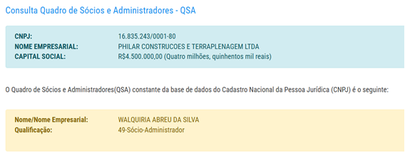 A proprietária da empreiteira, é identificada como Walquiria Abreu da Silva, sendo a única administradora da empresa, segundo mostra o próprio quadro de sócios e administradores (QSA). Além disso, a empresa é classificada como Empresa de Pequeno Porte (EPP), com um capital social de R$ 4,5 milhões.
