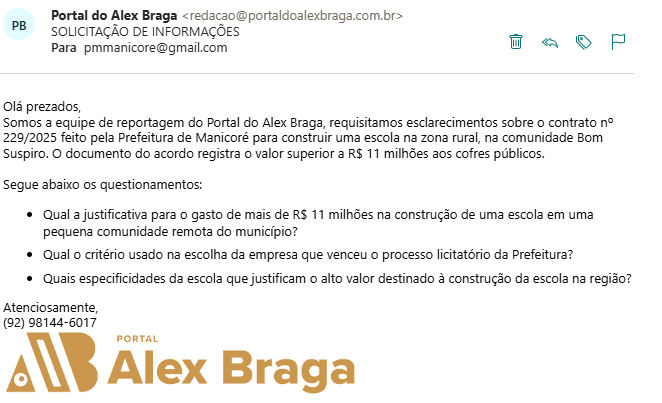 A equipe de jornalismo do Portal do Alex Braga, tentou contato com a prefeitura de Manicoré, para pedir esclarecimentos e uma justificativa sobre o alto valor milionário e a escolha da empresa para construir a escola. Contudo até o fechamento do desta matéria, não obtivemos retorno por parte dos envolvidos. O espaço segue aberto para mais esclarecimentos.