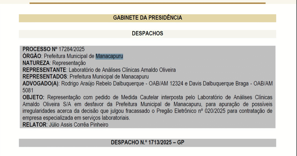 O laboratório solicitou ao TCE-AM medida cautelar para suspender os efeitos da decisão e retomar o processo à fase recursal, o que foi aceito preliminarmente pelo Tribunal. A Corte entendeu que a representação cumpre os requisitos legais e determinou o encaminhamento do caso ao relator, conselheiro Júlio Assis Corrêa Pinheiro, para análise detalhada da possível ilegalidade.